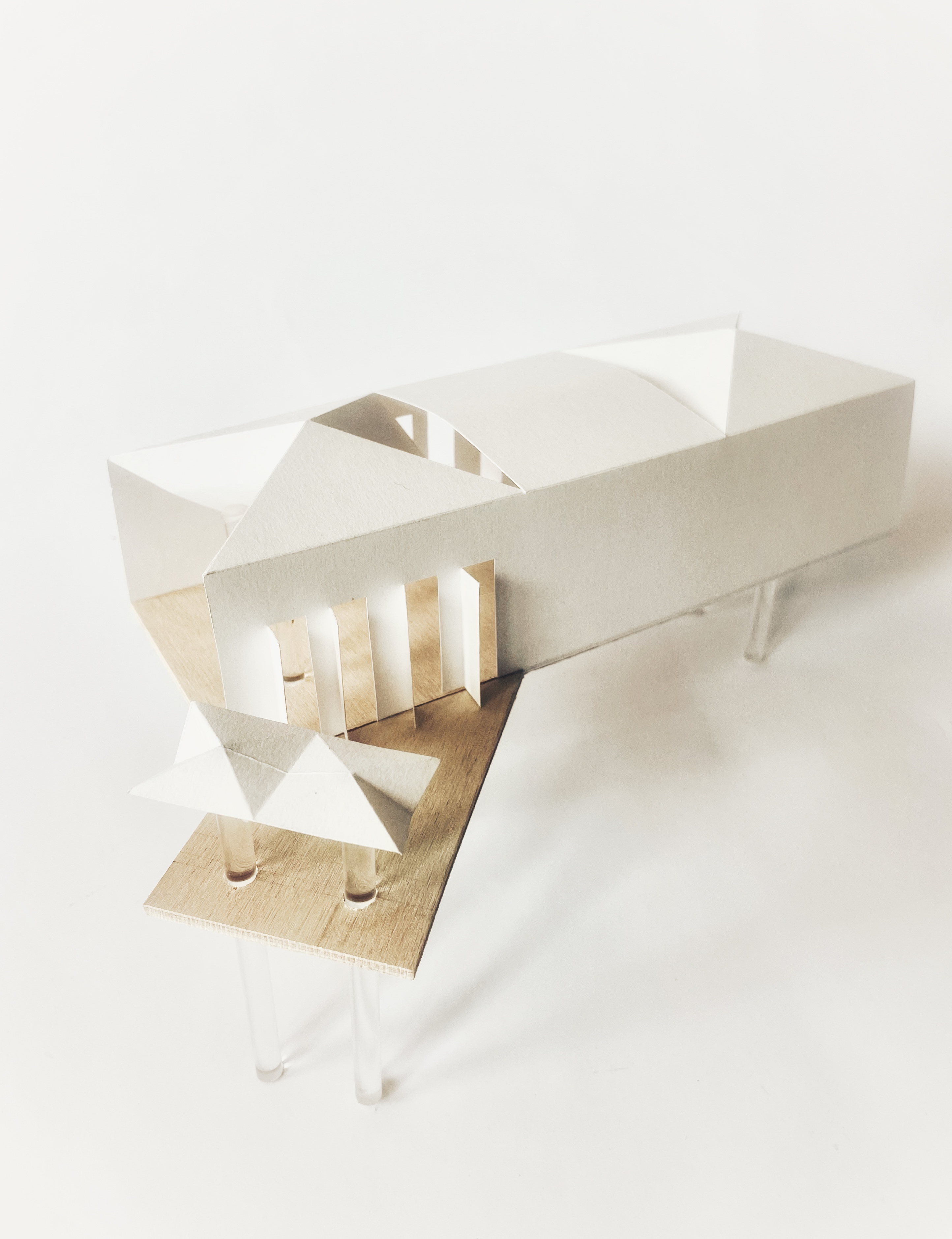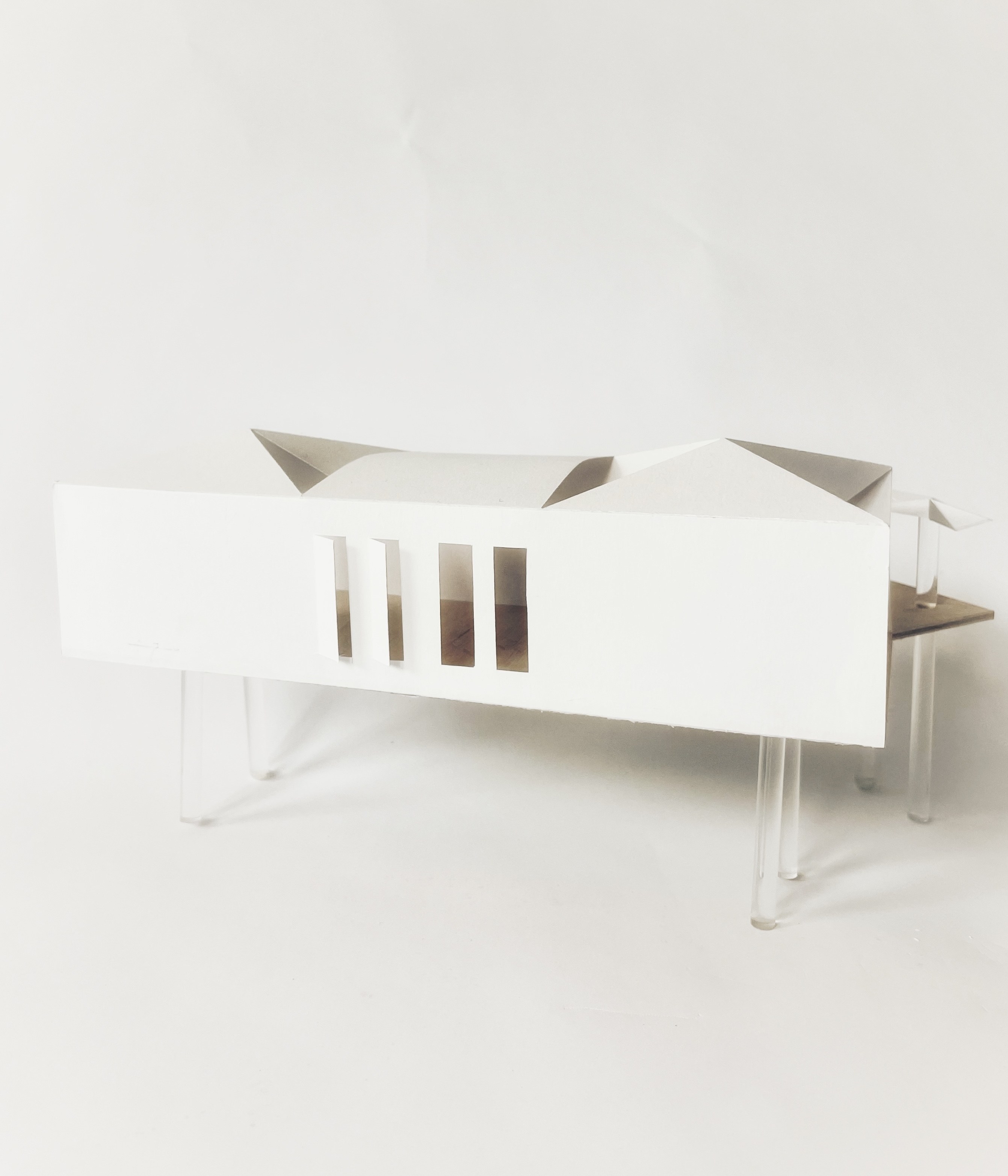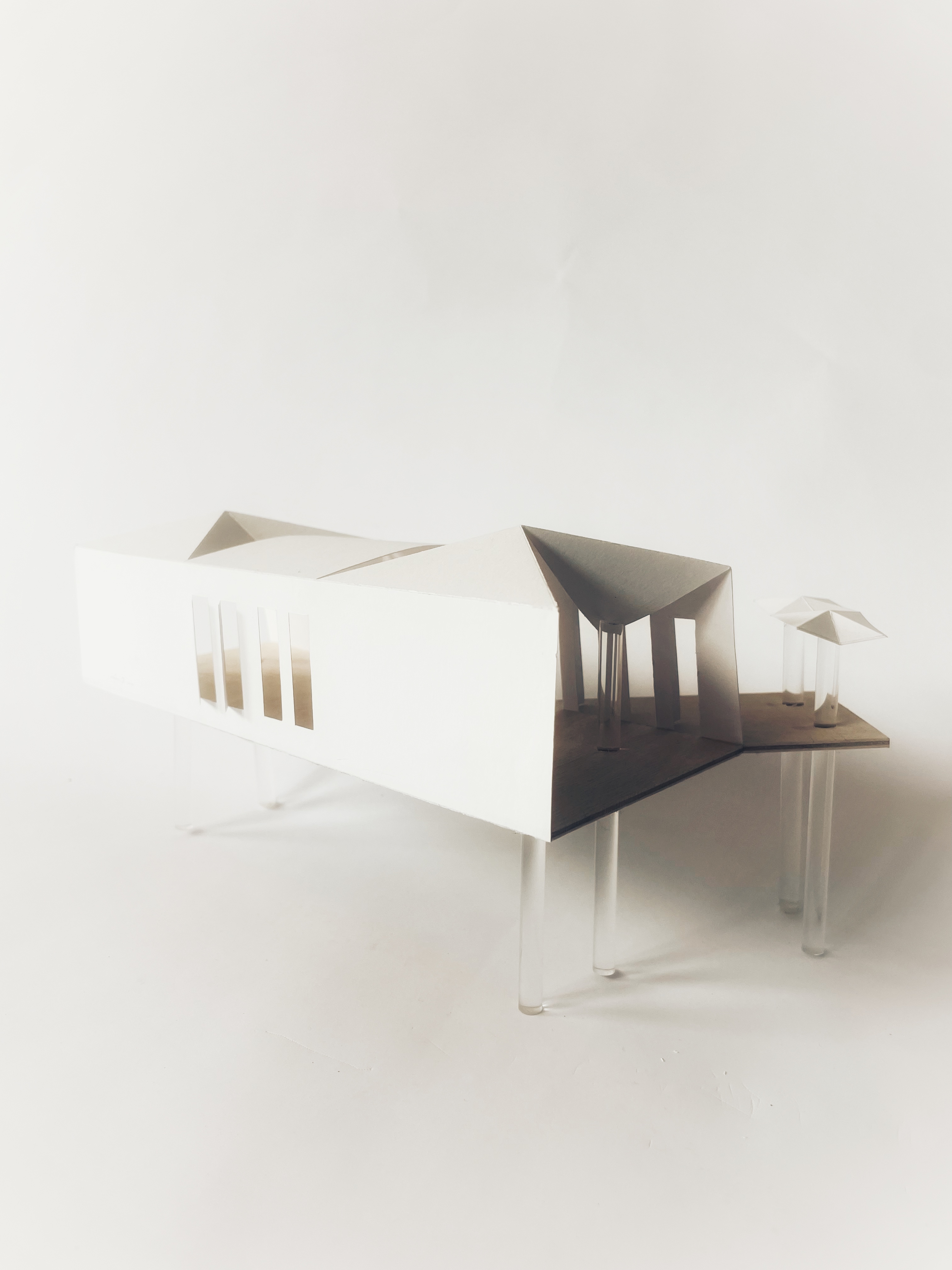 Perched on a rocky hillside overlooking a vast seascape, this building urges visitors to enjoy a stunning natural vista in a number of ways. The wide open ends of the form move us naturally through its narrow body, along which thinly sliced windows offer a tempting glimpse of what awaits us at the end of the gauntlet. Roof pieces are peeled back unexpectedly from the roof line, allowing the exterior legs (as seen in the stilts of coastal fishing perches and notably reimagined by architect Todd Saunders at his Fogo Island Inn) to become a feature of the interior as well.